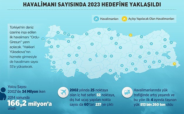 Aynı yılın 22 Temmuz 2011 tarihinde Ordu-Giresun Havaalanı’nın temeli atıldı. Ordu ve Giresunlular, adeta 3.5 yıldır havaalanı ile yatıp kalkıyor. Söz verildiği 1964 yılından bugüne kadar aradan geçen 50 yılda 8 Cumhurbaşkanı, 25 Başbakan, 41 Ulaştırma, 34 Bayındırlık Bakanı eskiten Ordu-Giresun Havalimanı, Cumhurbaşkanı Recep Tayyip Erdoğan’ın kararlı duruşu sayesinde hizmete giriyor.
