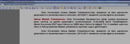 Dolayısı ile buradaki yani rapordaki ifade de benim anladığım " Aslında okulun 2008 yılında açılması kararlaştırılmış. Ancak akademik ve idari yapılanmayı yetiştiremedik. Ama 2010-2011 eğitim öğretim yılında bu çalışmaları tamamlayacağız ve okulu açacağız. Bu raporda da size okulun açılacağı dönemi de yazıyoruz ki, kesin açılacağı belli olsun. Ben rapordaki ifadeyi böyle anlıyorum. Kaldi Akkuş İlçesinde Okulun bakım onarım ve tamiri bitmek üzere olduğu bilgileri bizlere ulaştı. Akkuş'ta Sayın Rektörümüz Akkuş'un hazır olduğunu belirtti.