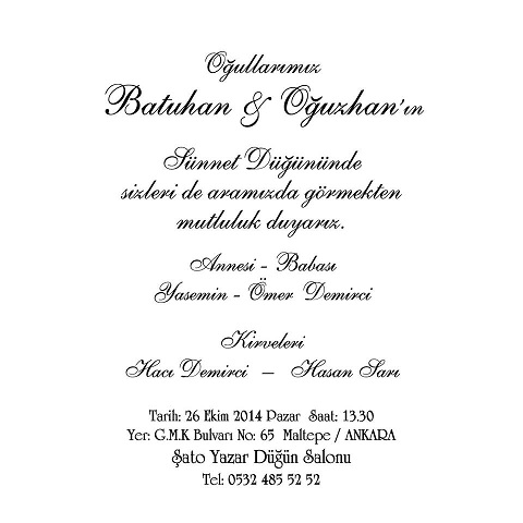 Sünnet Düğünü: 26 Ekim 2014 Pazar günü saat: 13.30 da