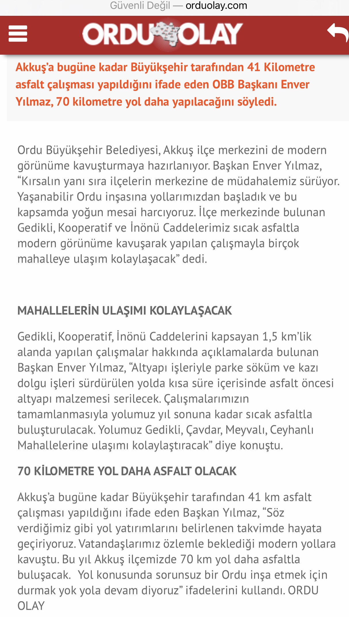2018 Yılında Ordu Büyükşehir. Akkuş İlçesine 70 Km Asfalt Yol Yapılacak Beyanı Var. 2020 de Akkuş’a Söz Verilen Asfalt Yol Yapılacak mı?