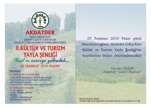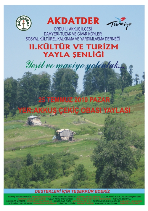 AKDATDER “ II. KÜLTÜR VE TURİZM YAYLA ŞENLİĞİ “ 25 TEMMUZ 2010 PAZAR GÜNÜ AKKUŞ ÇEKİÇOBASI YAYALASINDA YAPILACAKTIR.