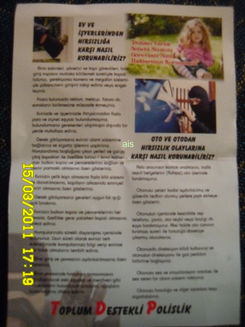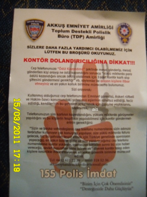 ÖZELLİKLE KENDİSİN POLİS OLARAK YADA KOMSER, EMNİYET AMİRİ GİBİ SIFATLARLA ARAYARAK, TELEFONUNUZDAN BİRİLERİ ARANMIŞ KÜFREDİLMİŞ YADA TACİZ YAPILMIŞ, YADA HATTINIZ TERÖRİSTLER TARAFINDAN KOPYALANMIŞ GİBİ İDDİALARLA ARAYIP, SİZİ BU DURUMDAN KURTARMAMIZ İÇİN BİZE KONTÖR YADA PARA GÖNDERMENİZ GEREKİYOR GİBİ, ARAYANLARA KESİNLİKLE İNANMAMALARI GEREKTİĞİNİ ÖZELLİKLE BELİRTTİLER. VE BU KONUYLA İLGİLİ MUHTARLARA BROŞÜR DAĞITILDI.