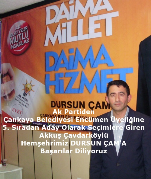 Dursun ÇAM kardeşim öyle bir sorumluluk altına girdi ki; yada şöyle desek yanlış olmaz aslında. Onun büyük çabaları ve özverili çalışmaları ile ilkeli duruşu ve halk ile olan iyi ilişkileri gözden kaçmadı. Dursun'nun mensubu bulunduğu parti üst düzey yetkililerince de bu başarılı çalışma fark edildi. Daya iyi, daha üst görevi layıkı ile yapacağından şüphesi olmayan parti yönetimi kendisi yani Akkuş Çavdarköylü Hemşehrimiz DURSUN ÇAM'ı Ak Partiden Çankaya Belediyesi Belediye Encümen Üyesi adayı seçti. Hemde öyle bir sıra verdiler ki; işte bu 5. sıra dediğimiz sorumluluk vede seçilmesi halinde Türkiye'nin en güzel, en büyük ilçesine hizmet etme. Belediye yi yönetmede görev alma sorumluluğu büyük sorumluluk değilde nedir peki.