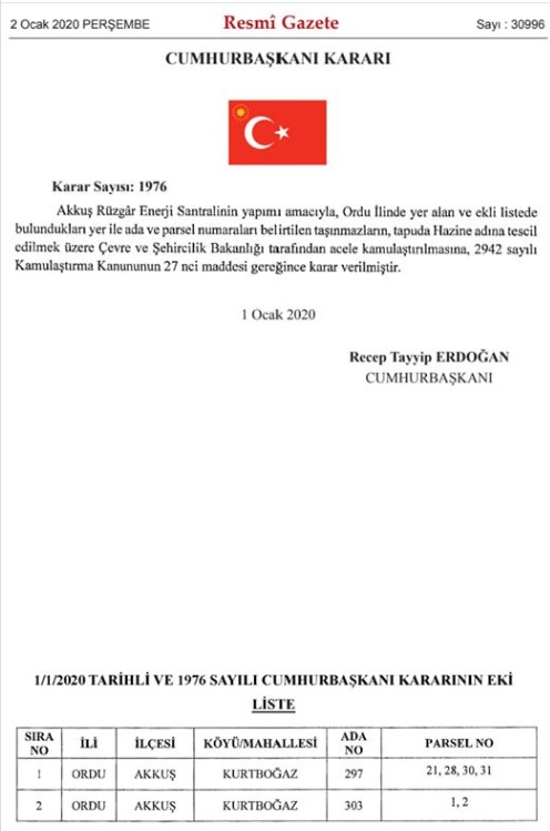 Akkuş İlçesine Rüzgar Enerji Santralının Yapımı İçin Kurtboğaz Mahallesinde Acilen Kamulaştırma Yapılacaktır. Kararı Cumhurbaşkanı İmzaladı. 2 Ocak 2020 231 Akkuş İlçesine Rüzgar Enerji Santralının Yapımı İçin Kurtboğaz Mahallesinde Acilen Kamulaştırma Yapılacaktır. Kararı Cumhurbaşkanı İmzaladı.