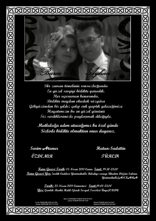 Kına: 15 Nisan 2011 Cuma Saat 19.30-23.00 İvedik Caddesi Yenimahalle Belediye Sarayı İlkadım Düğün Salonu Yenimahalle/ANKARA