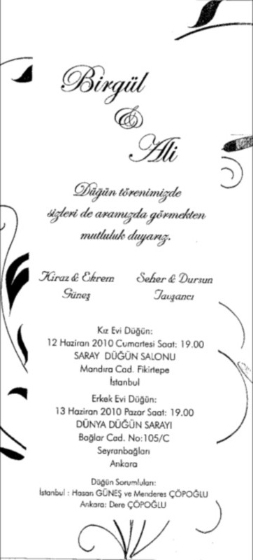 13 Haziran 2010 Pazar Günü Saat 19.00 Ankara Seyranbağları Dünya Düğün Salonunuda Yapılacak Düğünlerde