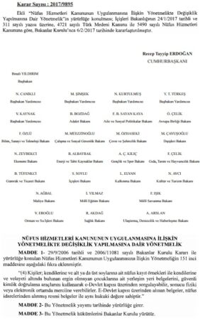 İçişleri Bakanlığının söz konusu yönetmelik değişikliğinin yürürlüğe konulması 4721 sayılı Türk Medeni Kanunu ile 5490 sayılı Nüfus Hizmetleri Kanunu hükümleri doğrultusunda 6 Şubat’ta Bakanlar Kurulunca kararlaştırıldı.