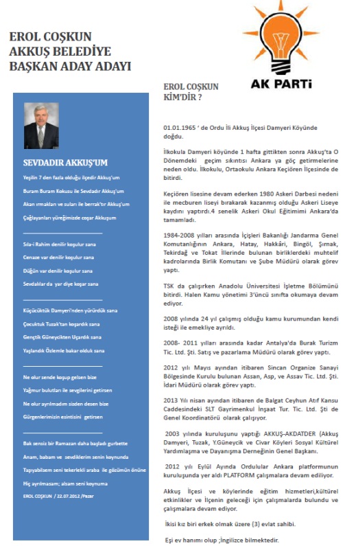 Akkuş İlçesi İnternet Sitesi olarak Erol COŞKUN'a başarılar diliyoruz. Şansının Bol Olmasını Temenni Ediyoruz.