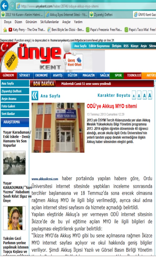 unyekent.com internet sitesi 13.07.2013 günü yaptığı haberde; Akkuş İnternet Sitesinin yapımcılarından İhsan ÇAM'ın kaleme aldığı yazıyı haber yaparak, hem İhsan ÇAM'a hem Akkuş İnternet Sitesine hemde Akkuş MYO'na destek vermiştir. Teşekkür ediyoruz. Sözkonusu haber aşağıdadır.